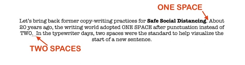 Hey copywriter, I’m typing this for you! Bring back the double-space for punctuation for safer social distancing. We stopped when the computer replaced the typewriter. Don’t smirk, about a 1/3 of us still type this way (yes I’m one; okay boomer) And science is on my side marketing type…You read 3% faster with double space; as proven by a 2018 study by the American Psychological association.